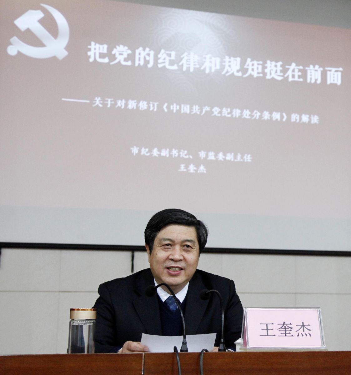 課上,王奎杰結(jié)合實(shí)際案例,以圖文并茂的形式,從修訂《條例》的重大意義、修改了哪些內(nèi)容、領(lǐng)導(dǎo)干部如何貫徹執(zhí)行好等三個(gè)方面,對《中國共產(chǎn)黨紀(jì)律處分條例》行了全面闡釋。并著重就如何把握《條例》的總則和違反政治紀(jì)律、組織紀(jì)律、廉潔紀(jì)律、群眾紀(jì)律、工作紀(jì)律、生活紀(jì)律的重點(diǎn)問題作了詳細(xì)講解。
