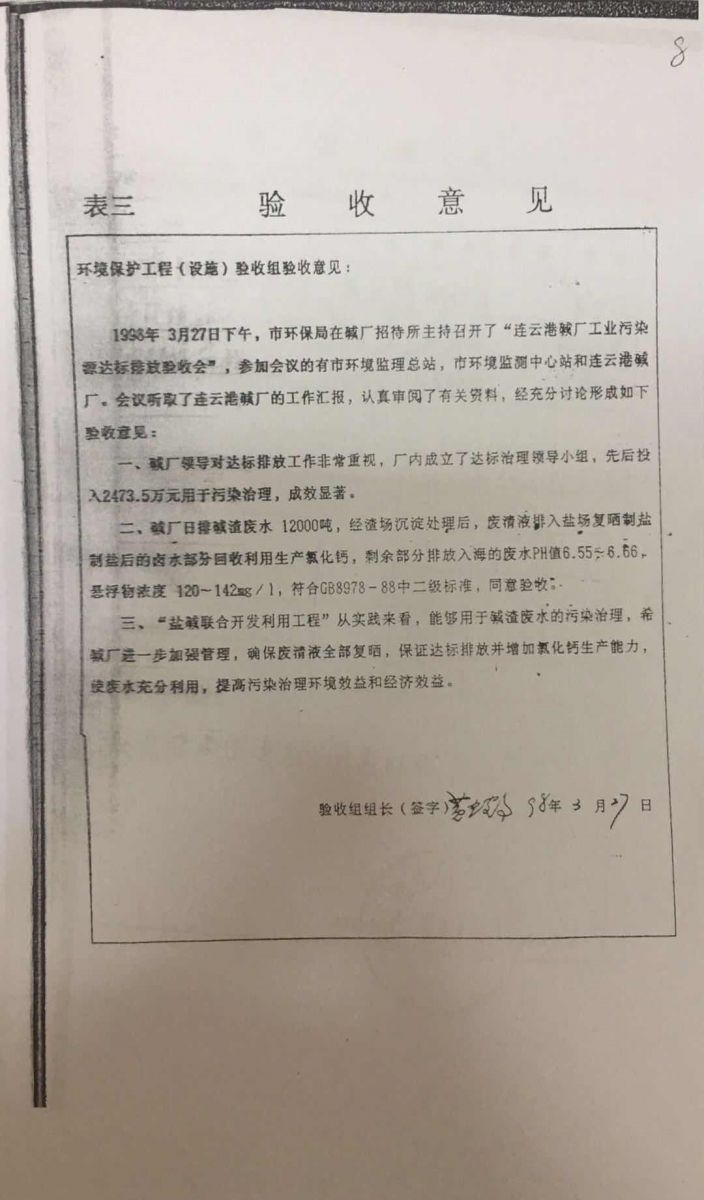 根據吉林化學工業公司設計院《連云港堿廠環境影響報告書》和原江蘇省環境保護局《關于對連云港堿廠環境影響報告書的批復》(蘇環管〔86〕31號)的要求,連云港堿廠產生的廢液送至渣場,經澄清后,上清液經自有排口閘直接排海。1997年,根據淮河流域水污染防治的要求,連云港市環保局向連云港堿廠下達了《關于淮河流域水污染源限期達標排放的決定》(連環管〔1997〕16號)。據此,連云港堿廠與臺北鹽場合作開發了“堿渣場上清液回收利用工程”項目,利用上清液制鹽、制鈣。1998年3月27日,該項目通過連云港市環保局組織的環保驗收,正式運行。