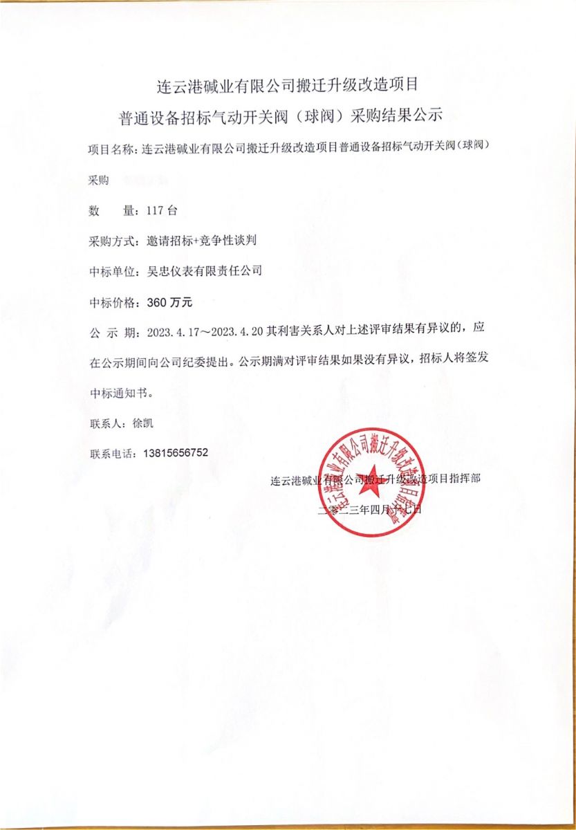 氣動開關閥(球閥)采購結果公示